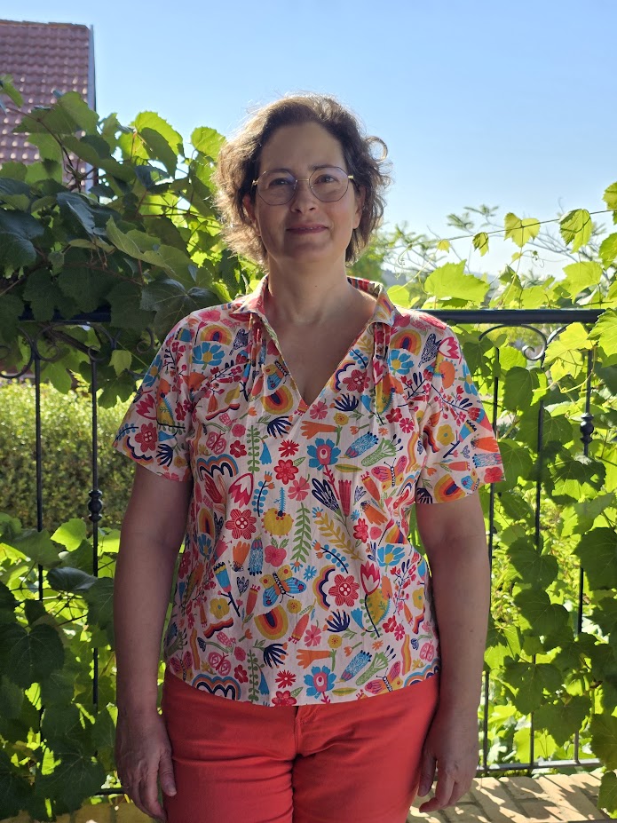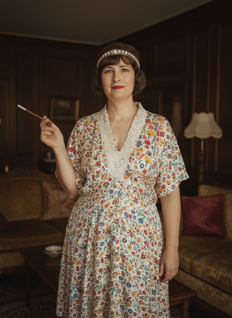 שמתי לב שהוא התאהב במיוחד בהדפס של החולצה הססגונית שתפרתי לי, והשתמש בו שוב ושוב, לפעמים כחולצה בגזרה שונה ולפעמים בחלק אחר של התלבושות. הוא גם השאיר את התיפורים בכתפיים בכמה מהווריאציות. מצאה חן בעיני במיוחד החצאית הנפוחה של שנות החמישים שהוא התאים לחולצה צהבהבה, והגרסה שלה בשנות העשרים.