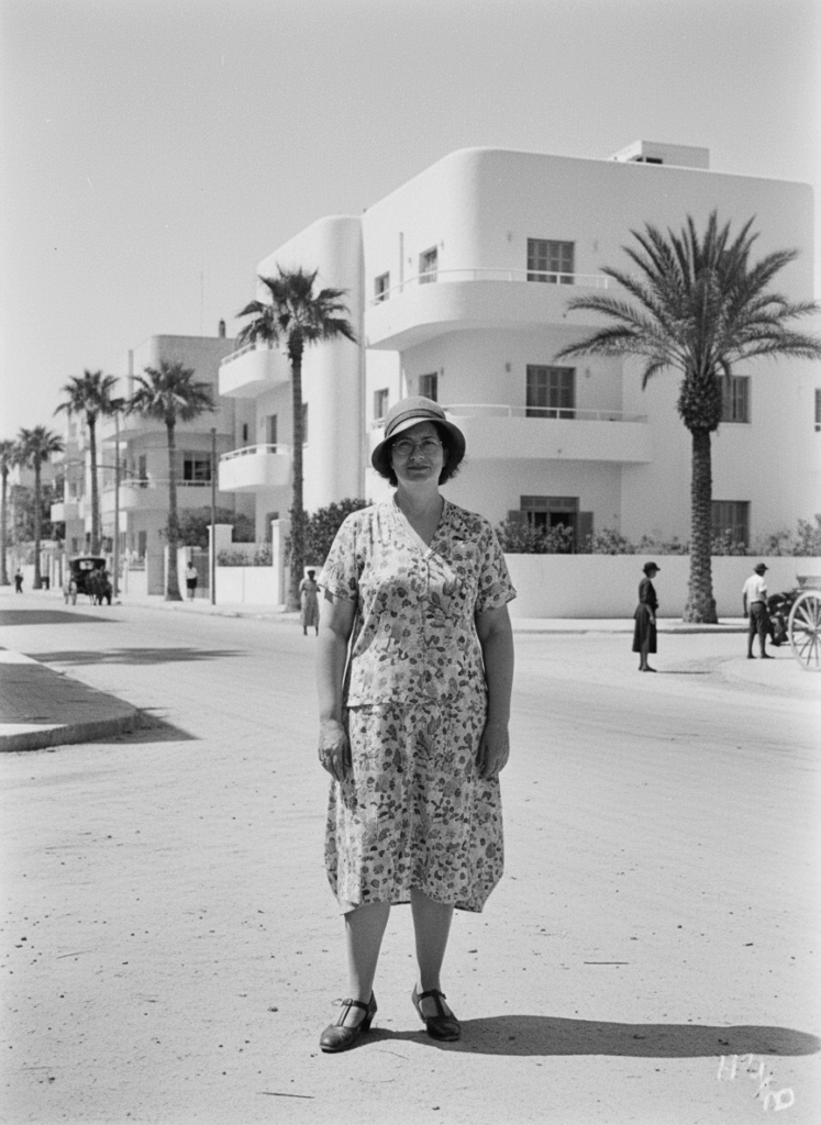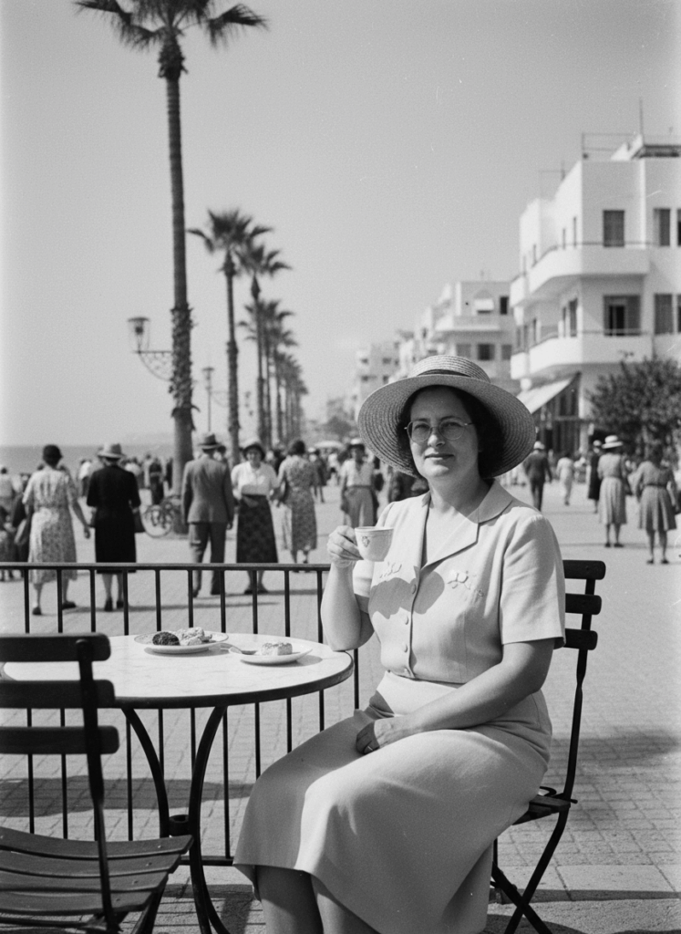 בהמשך הגדרתי לו שאני רוצה תמונות לאורך המאה העשרים בישראל. השמש המזרח-תיכונית ניכרת בכל התמונות, והדמות שלי מצמצמת עיניים מולה. עושה רושם שאני חלוצה חרוצה, שמוצאת קצת זמן לפוש בבית קפה בעיר הלבנה על רקע הבאוהאוס התל אביבי, גם אם בשנות הארבעים יצאתי דומה קצת יותר מדי לבן-גוריון.