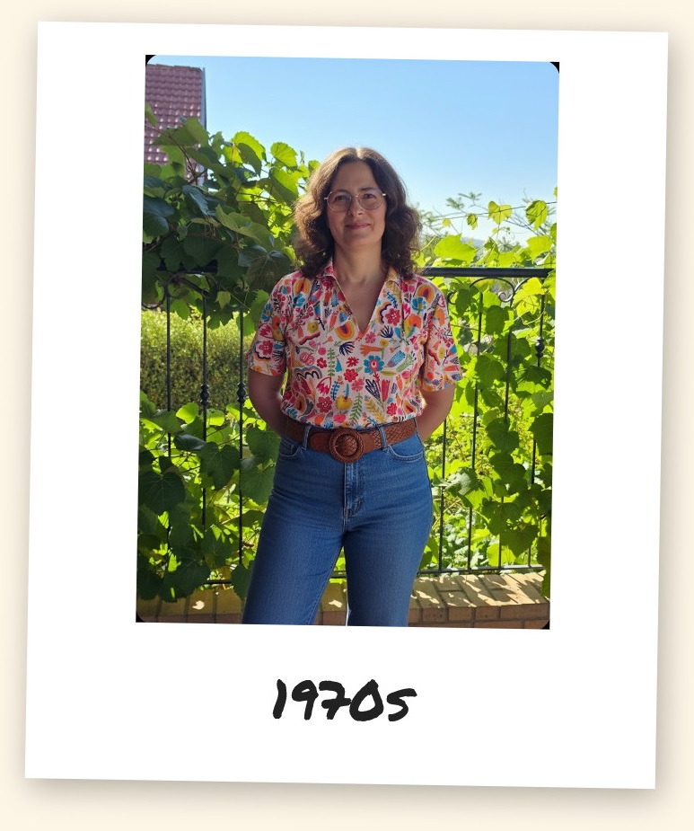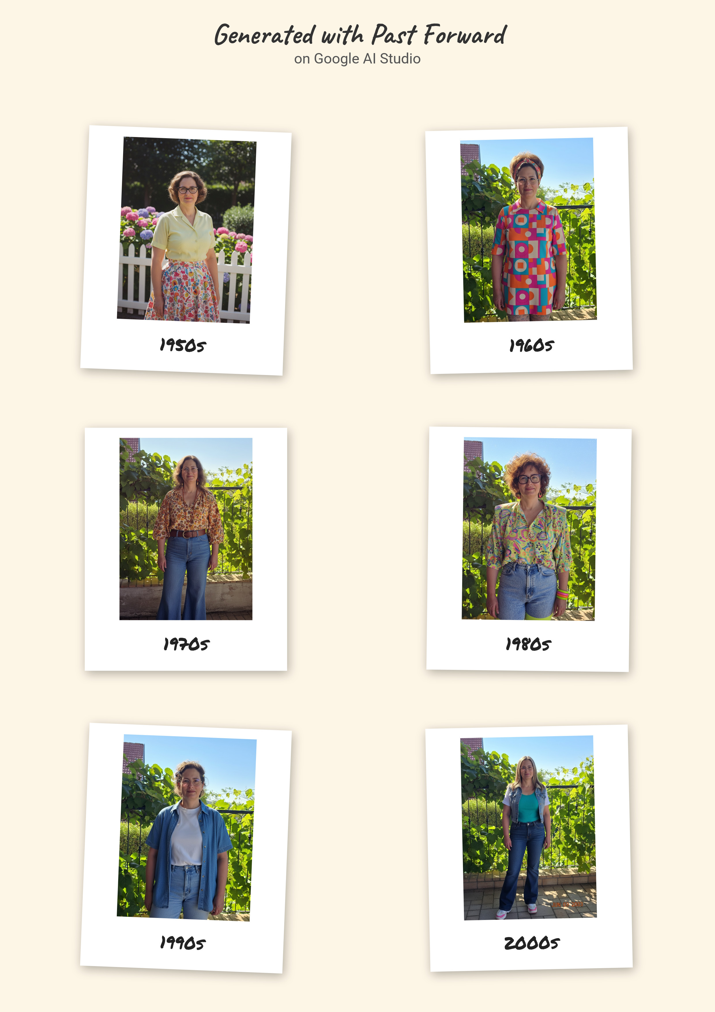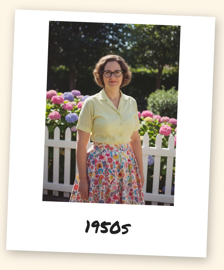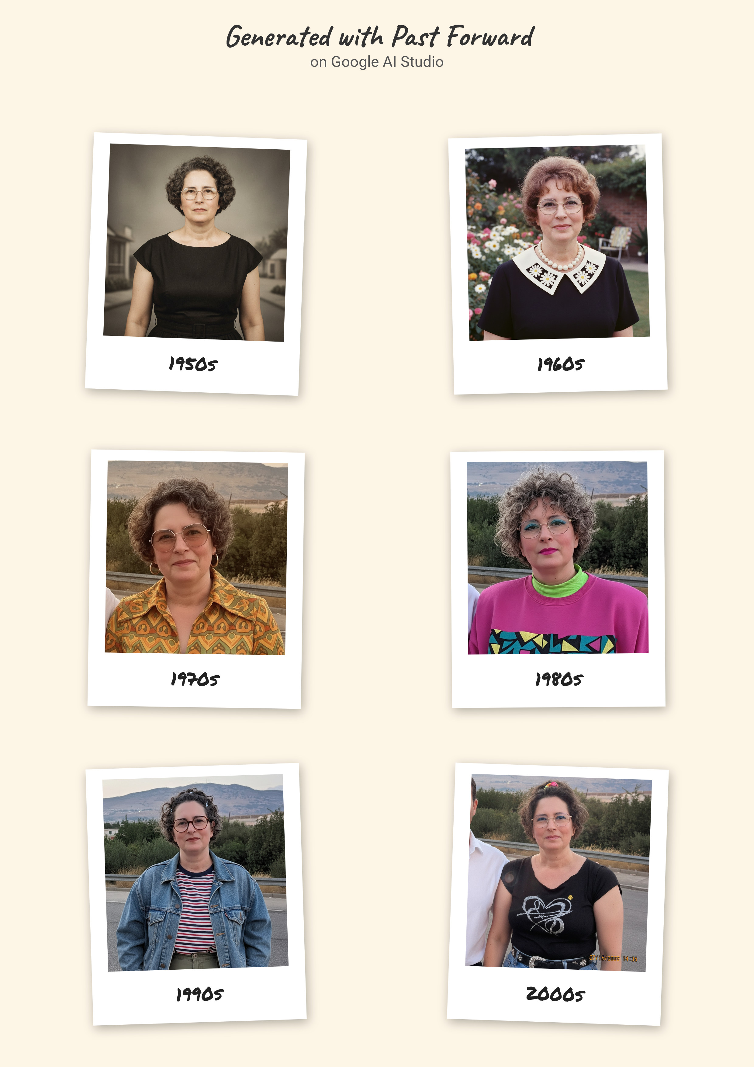 כלי הבינה המלאכותית של גוגל, AI Studio, יודע מה צריך ללבוש למסע בזמן. בהגדרה הבסיסית שלו הוא מזמין להעלות תמונה ומייצר וריאציות שלה לפי הלבוש המקובל למיטב ידיעתו בשנות החמישים, השישים, השבעים, השמונים והתשעים של המאה העשרים והעשור הראשון של המאה העשרים ואחת (מתברר שזה כבר נחשב וינטג', למרבה הזעזוע האישי שלי מהגדרה כזאת לחלק גדול מהבגדים בארון שלי).