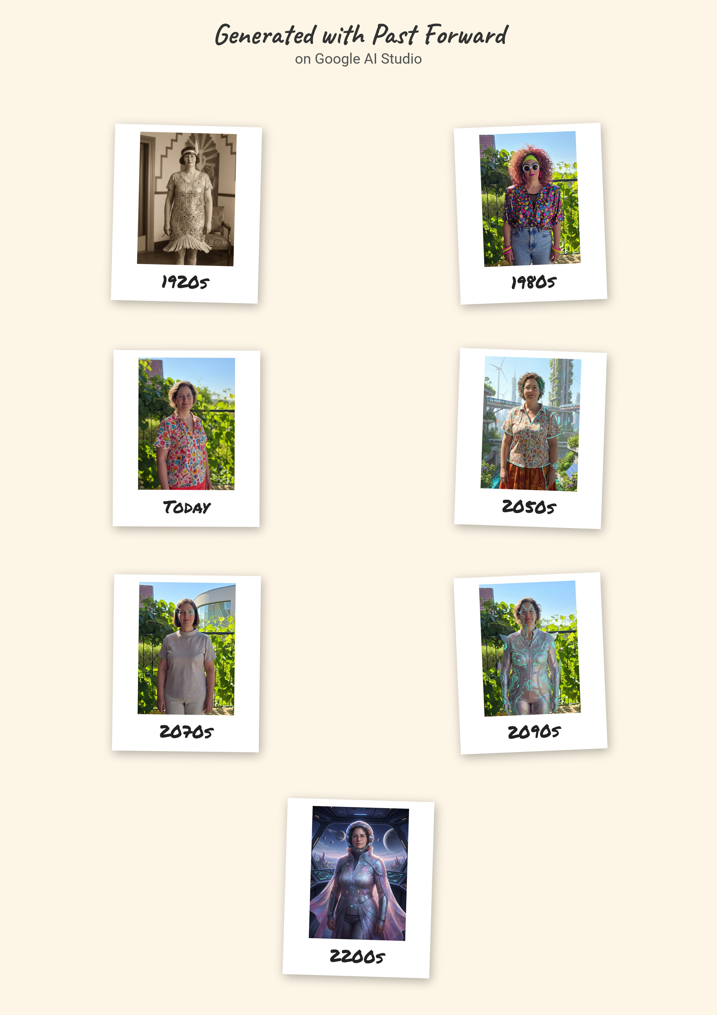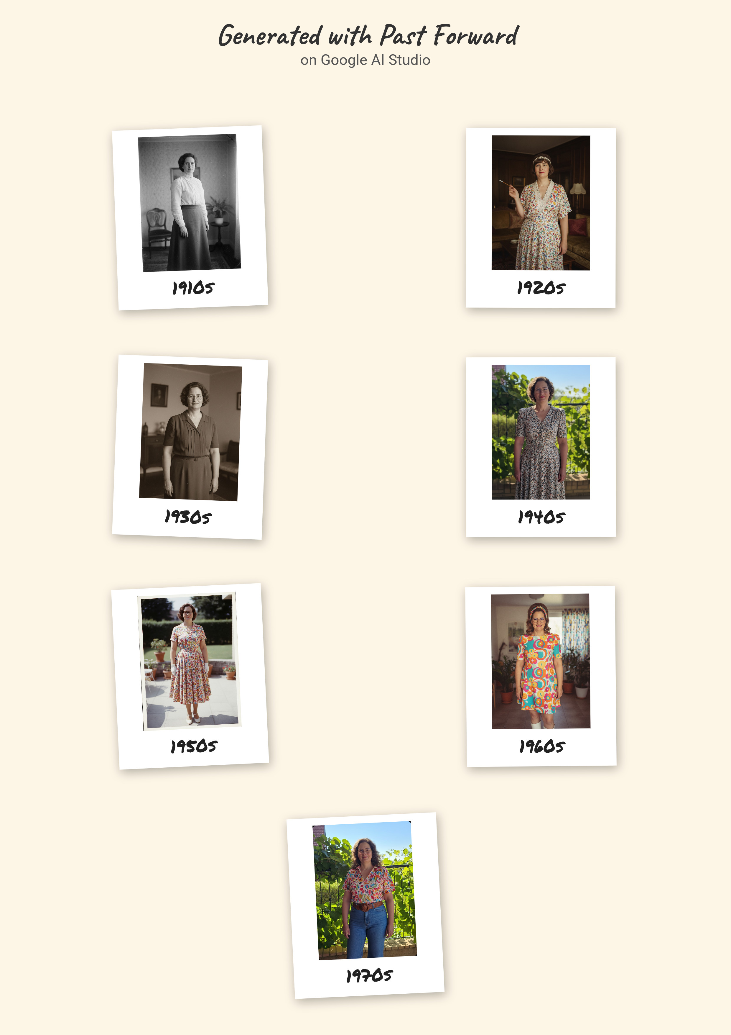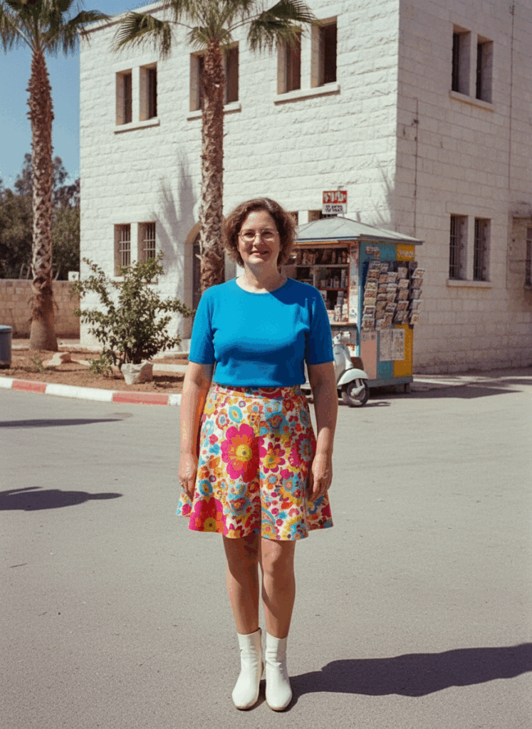 כלי הבינה המלאכותית של גוגל, AI Studio, יודע מה צריך ללבוש למסע בזמן. בהגדרה הבסיסית שלו הוא מזמין להעלות תמונה ומייצר וריאציות שלה לפי הלבוש המקובל למיטב ידיעתו בשנות החמישים, השישים, השבעים, השמונים והתשעים של המאה העשרים והעשור הראשון של המאה העשרים ואחת (מתברר שזה כבר נחשב וינטג', למרבה הזעזוע האישי שלי מהגדרה כזאת לחלק גדול מהבגדים בארון שלי).