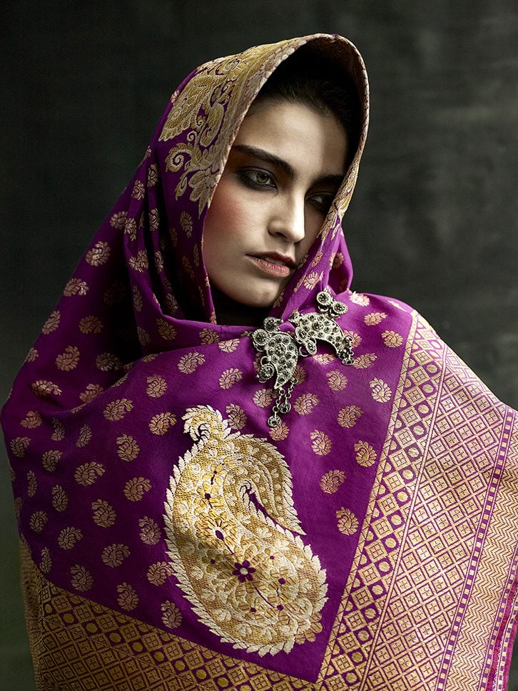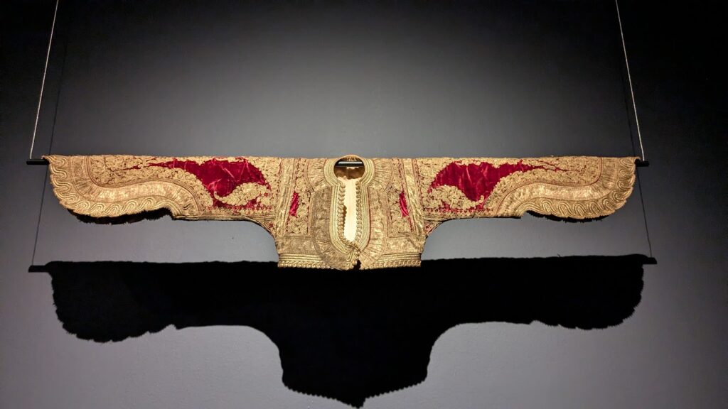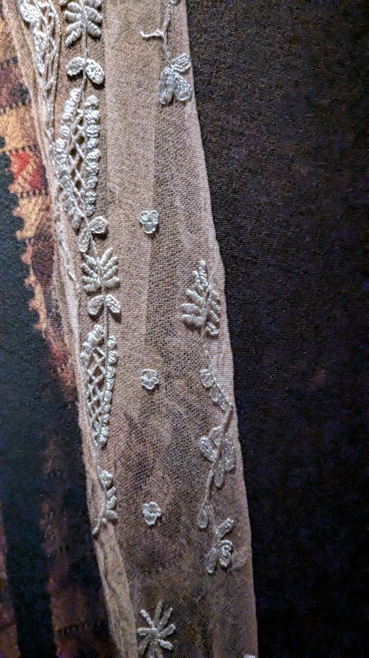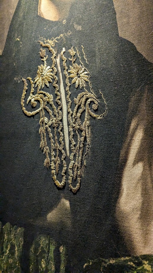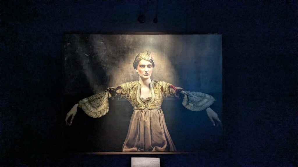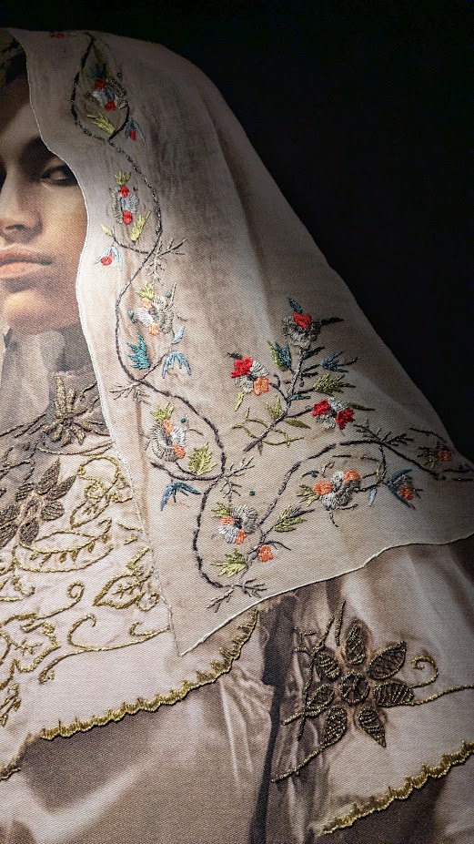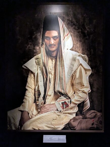 תצלומי הדיוקן דרמטיים בהעמדה, באיפור ובסגנון. הם הודפסו על בדי כותנה או קנווס גדולים, ועל חלקם נרקמו בסדנת אמן פרטים נבחרים ועדינים של רקמות זהב, מתכות עדינות וכותנה, המשחזרות מסורות רקמה עתיקות (קרדיטים בסוף הפוסט). טיפ לזמן הביקור, מפיה של עובדת המוזיאון: אם בפינה התחתונה יש חתימה רקומה, סימן שיש רקמה על הצילום וכדאי להשתמש בפנס של הטלפון כדי להבחין בפרטים התלת-ממדיים. יש צילום אחד בתערוכה שמותר למשש, אפשר לשאול את הצוות במקום (כי בשאר הפריטים כמובן אסור לגעת).