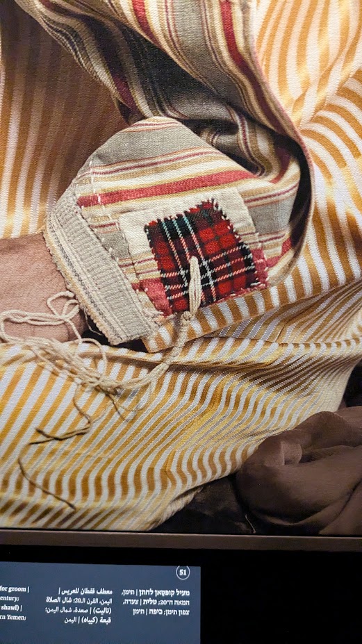 בניגוד לעושר הניכר של רוב הפריטים, המעוטרים רקמה, קטיפה, מתכות יקרות ועוד, שמתי לב דווקא לפרט קטן בתלבושת גבר, מעיל קופטאן לחתן וטלית מתימן (על הדוגמן דור אבו). בפינות הטלית יש טלאים מבד משבצות, אולי אפילו בד טרטן סקוטי, מחוברים בתפירת יד, לחיזוק ו/או לקישוט.