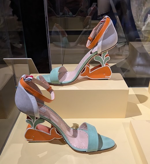 נעליים ימיות: באלה של שאנל קשר בחבל מקשט את העקב ותיק היד מעוצב בהשראת קיטבג, ואילו בדגם הצבעוני של תום בראון יש לוויתן ונתז מים המשמשים להגבהה.
