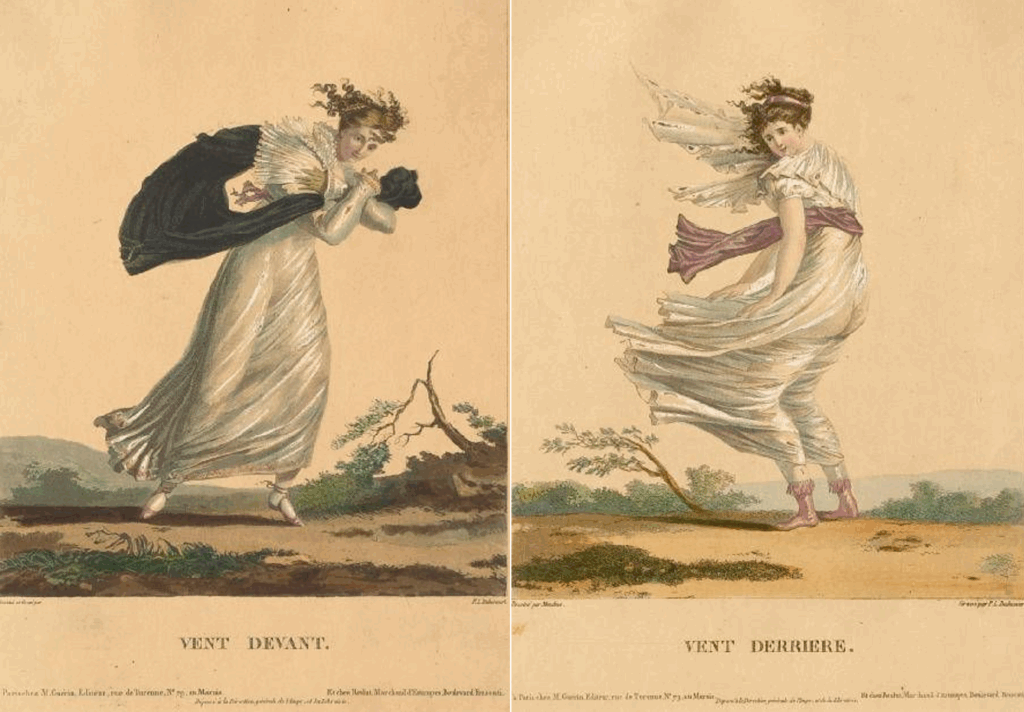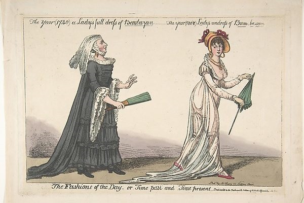 איורים וקריקטורות הדגישו את ההבדלים בין אופנת העבר הקשיחה והסגורה לשמלות החדשות בסגנון "אמפייר". כותרת האיור מעל היא "יותר מדי" לעומת "מעט מדי". לאיור הבא ניתנה כותרת עם משחק מילים: The Year (1740) a Lady's Full Dress of Bombazeen – The Year (1808) Lady's Undress of Bum-be-seen. כלומר, בשנת 1740 הגברת לובשת בומבזין (סוג בד) ובשנת 1808 ישבנה מוצג לראווה.