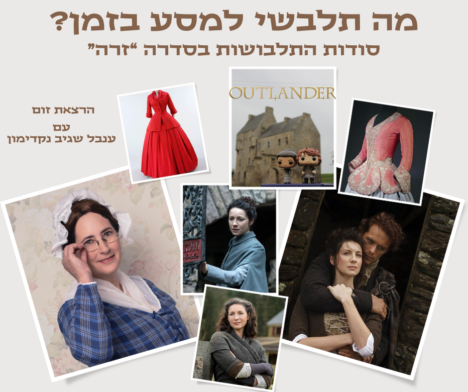 השמלה שלובשת קלייר במסעה הראשון בין התקופות שונה בתכלית מהחליפה שהיא מעצבת לעצמה בהמשך. ולא במקרה: בגדיהן של הדמויות מִתְבלים, עוברים מיד ליד ומשנים גזרות וסוגי בד, כשהם שוזרים את העבר בעתיד ואת העתיד בעבר. ההרצאה תציג לעומק את התלבושות לכל אורך הסדרה, כולל סיפורים מאחורי הקלעים של אתרי הצילומים בסקוטלנד ומקורות השראה מההיסטוריה של האמנות והאופנה.
